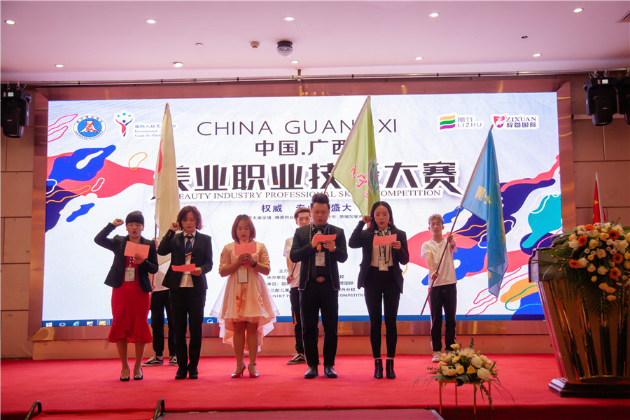 評(píng)委代表上臺(tái)宣誓:李遂中(美發(fā)評(píng)委)、黃海紅(紋繡評(píng)委)、吳艷陽(yáng)(美甲評(píng)委)、蘇貴霞(化妝評(píng)委)、陸玉清( 美容評(píng)委)