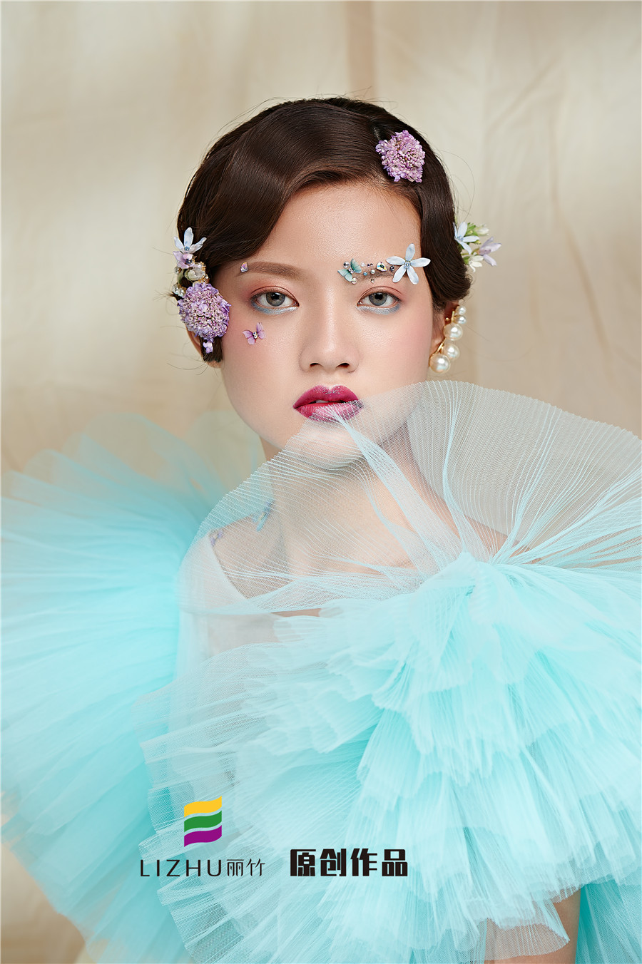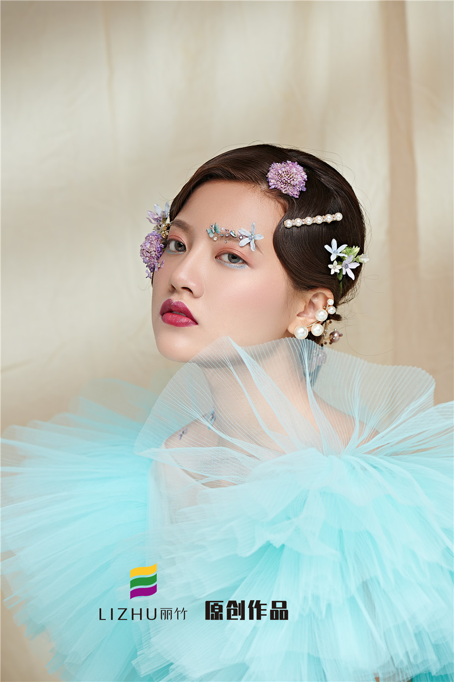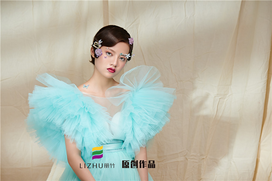藍(lán)色輕紗加上妝容花朵點(diǎn)綴
