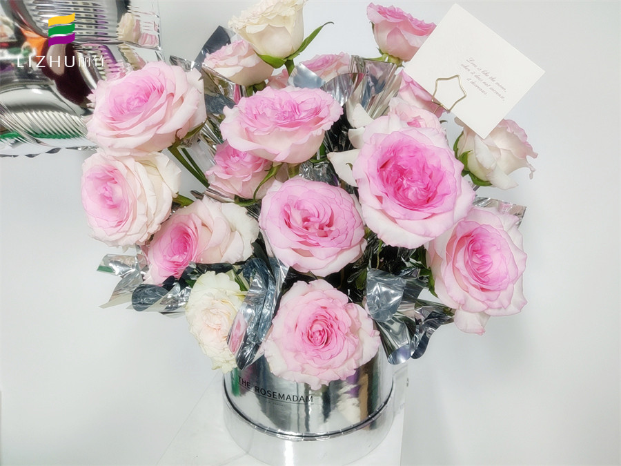 之后,在用剩余的銀色包裝紙折成紙花,插入花朵間的縫隙,直至整束花朵變得飽滿。值得注意的是,這里的紙花只是起到將花束弄得飽滿的點(diǎn)綴作用,因此高度要低于花朵的高度。為了讓花束更有層次感,還可以插上和花筒同色系的愛心氣球做裝飾。之后在插上寫滿祝福語(yǔ)的小卡片,這樣一個(gè)浪漫的抱抱桶花束就完成啦!
