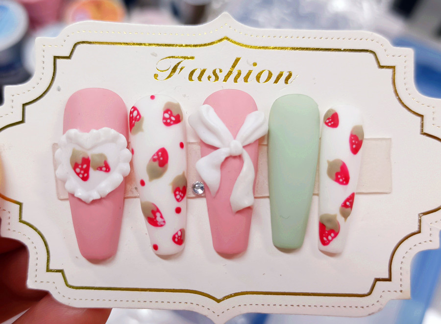 廣西學美甲:以少女們喜愛的粉色和白色作為主色調,馬卡龍綠色則作為點睛之筆。之后使用彩繪筆專業(yè)描繪出可愛草莓圖案,配上粘貼白色蝴蝶結和愛心飾品做點綴,直接將草莓彩繪美甲的可愛感氛圍拉滿。