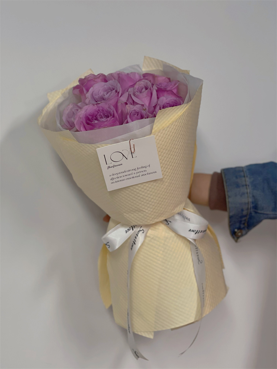 在進(jìn)行圓形花束的制作時(shí),在確定主花后,便可以按照螺旋的方式一次添加花材,使得整束花看起來飽滿之后,稍作調(diào)整成為一個(gè)圓形的輪廓,然后便可以用繩子在根部綁好進(jìn)行修剪?;ú奶幚砗昧酥?,將包裝紙裁剪出適當(dāng)?shù)拇笮。缓蟾鶕?jù)花的形狀包裹起來,用彩帶幫緊并打成一個(gè)蝴蝶結(jié),這樣圓形小花束就完成了。