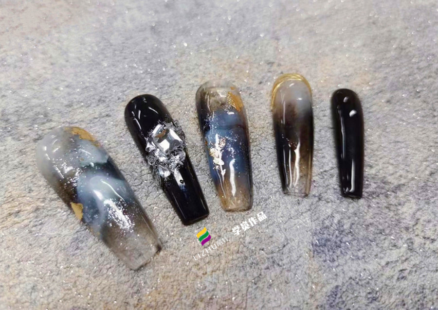 零基礎(chǔ)學(xué)美甲暈染、廣西美甲哪家好:做好大理石暈染美甲的前提,必須要掌握好暈染的步驟。先用甲油膠隨意點(diǎn)色塊案,之后在用暈染筆將色塊暈開(kāi),注意顏色過(guò)渡自然。圖案暈染好之后,就可以粘貼喜歡的飾品啦。而廣西美甲款式進(jìn)修班(麗竹美甲進(jìn)修班)的同學(xué)們也在課堂上完成了老師布置的作業(yè),一起來(lái)看看吧!