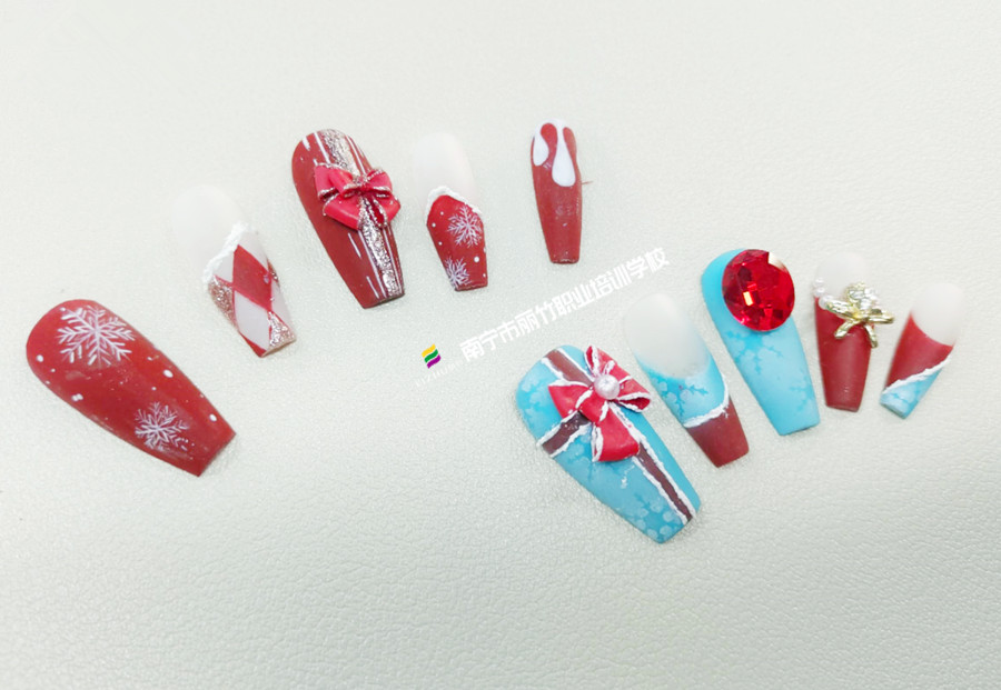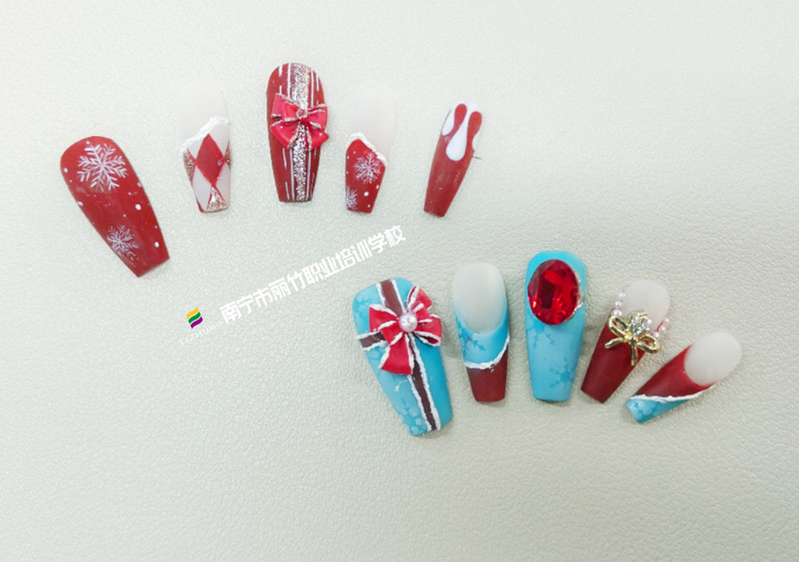 廣西美甲教育、廣西美甲培訓中心:說起圣誕節(jié)主題美甲的元素,浮現在你腦海里的都有什么呢?圣誕老人?圣誕樹?雪花?麋鹿?雪橇?禮物?無論你想到的是什么,不如現在就像廣西南寧美甲款式進修班(麗竹美甲款式進修)的同學們一樣,在甲面上畫出自己喜歡的圣誕美甲元素吧!