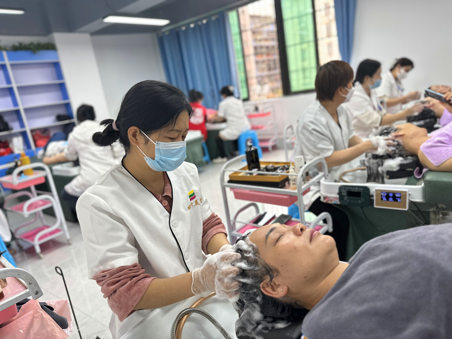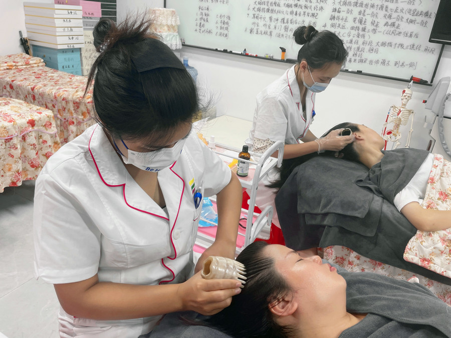 進(jìn)行健康養(yǎng)發(fā)頭療洗、姜療松筋洗操作