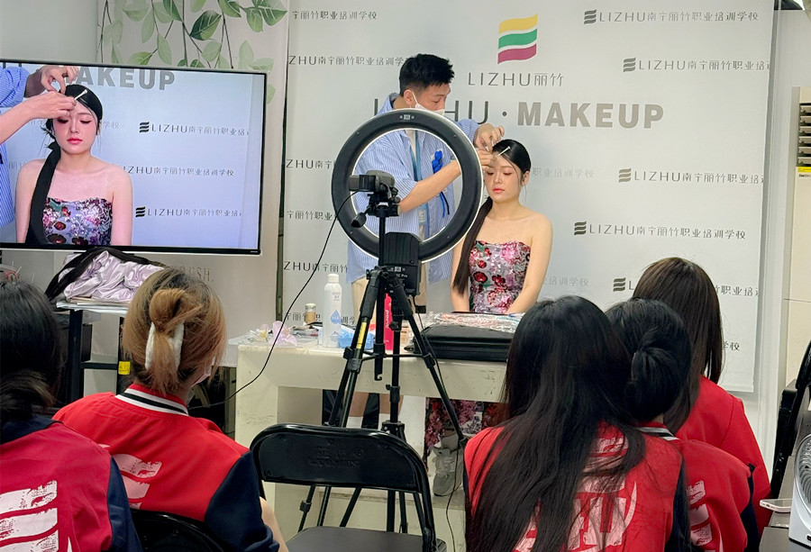 廣西化妝彩妝學(xué)校推薦、廣西化妝課堂:隨著國(guó)風(fēng)的興起,國(guó)風(fēng)元素也被廣泛運(yùn)用到了彩妝時(shí)尚行業(yè)領(lǐng)域中。隨著國(guó)風(fēng)潮流越來越人關(guān)注,“新中式”也成為了很多婚禮新人的選擇。下面,廣西彩妝進(jìn)修班(麗竹彩妝進(jìn)修班)就通過真人實(shí)操示范,為同學(xué)們講解新中式禮服新娘造型特點(diǎn)。