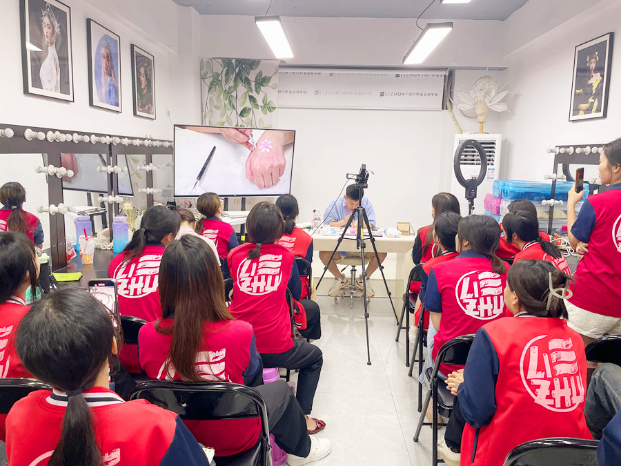 面部彩繪零基礎(chǔ)學(xué)習(xí)、廣西學(xué)面部彩繪:廣西彩妝化妝美妝造型學(xué)校(麗竹彩妝化妝造型學(xué)校)廣西彩妝造型進(jìn)修班的教室里,玉老師正在一邊給同學(xué)們講解廣西化妝面部彩繪教學(xué)里關(guān)于什么是面部彩繪的內(nèi)容,一邊通過(guò)在手上作畫(huà)演示彩繪的畫(huà)法。