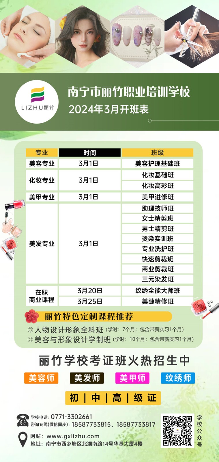 如果你想學(xué)習(xí)美業(yè)技術(shù),想在廣西零基礎(chǔ)學(xué)美容美發(fā)?想知道廣西化妝美甲培訓(xùn)在哪里?廣西哪里學(xué)紋繡專業(yè)?同時還想到廣西美睫學(xué)校去學(xué)美睫?那么,請你千萬不要錯過廣西美業(yè)專業(yè)職業(yè)學(xué)校-麗竹學(xué)校3月的開班安排了啦!早學(xué)早就業(yè),就能早點(diǎn)實現(xiàn)人生目標(biāo)。