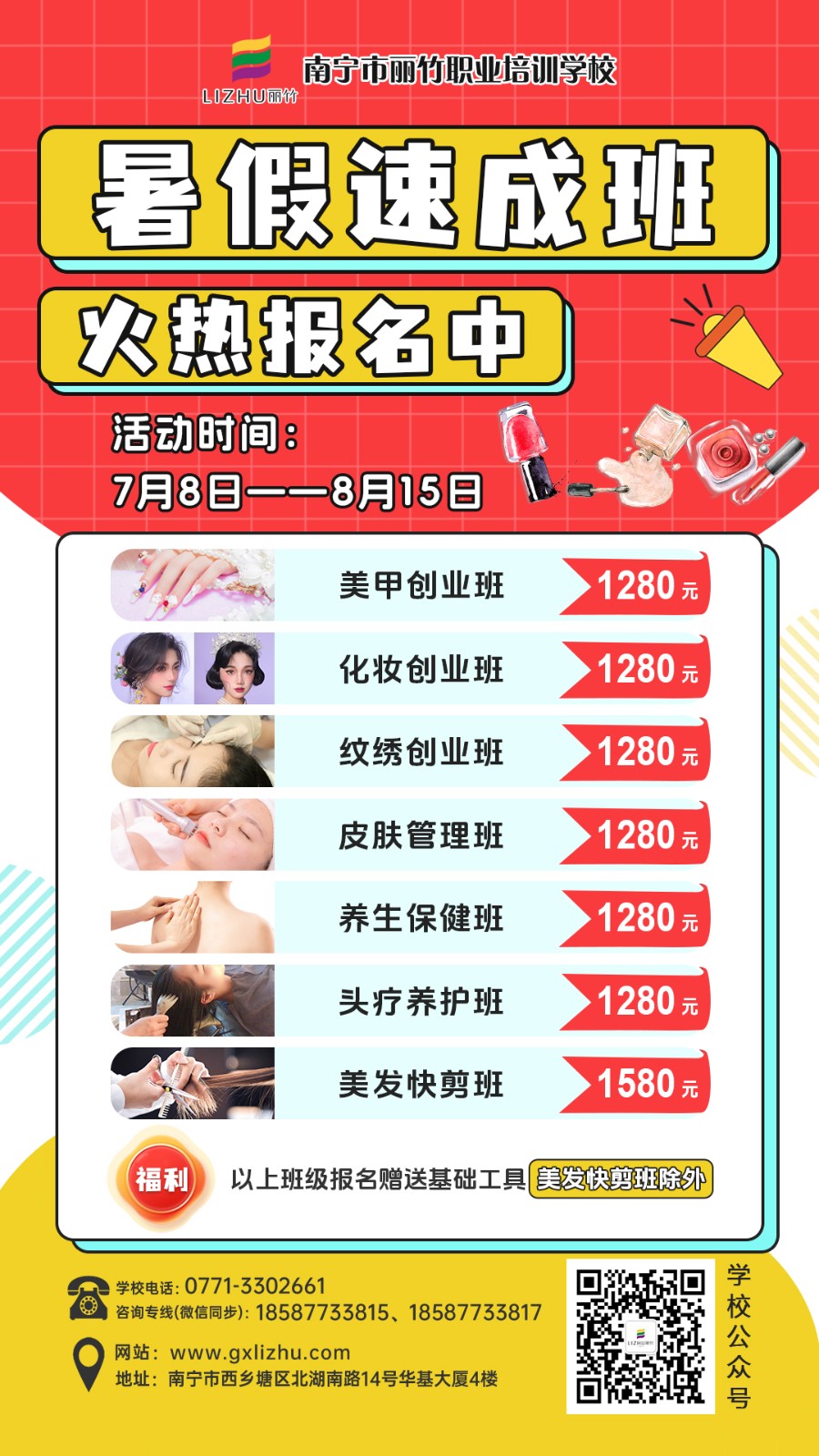 如果你想在廣西學(xué)美容美發(fā),想知道廣西化妝美甲學(xué)費(fèi)多少?想知道廣西紋繡去哪學(xué)……那就千萬不要錯(cuò)過廣西美容美發(fā)化妝美甲(麗竹學(xué)校)暑假速成班推出的課程報(bào)名活動(dòng)啦!